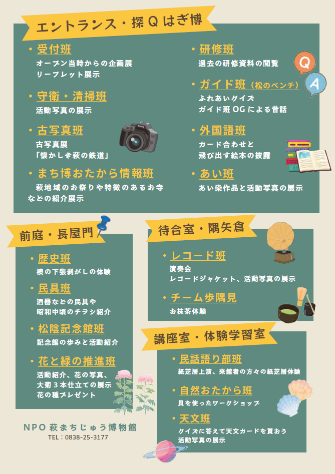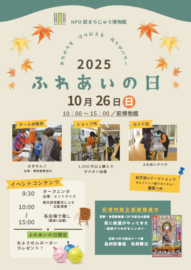----------------------------------------------------------- 10/26 NPO萩まちじゅう博物館 ふれあいの日を開催します!市民の皆さんや来館される方々に、NPOまち博の活動を知っていただくために、「ふれあいの日」を開催します。各班のふだんの活動の様子をパネル展などで発表するとともに、クイズやワークショップ、抹茶体験などをご用意しています。詳しくは、チラシをご覧ください。 ----------------------------------------------------------- 萩博物館レストランの愛称決定!!「萩博レストラン夏みかんの木」 萩博物館レストランは、NPO萩まちじゅう博物館が運営するレストランとして、多くの来館者に利用していただいております。 この度、より親しみをもって利用いただけるよう愛称を募集したところ、全国から390件の愛称応募が有りました。 大変多くのご応募いただき厚くお礼申し上げます。 詳しくはこちらをご覧ください。 ------------------------------------------------------------- ■お知らせ 「春日子供太鼓」「着物ショー」動画をYou Tubeに載せました!(2024/11/19) 右のYou Tubeをクリックしてもらうと見れます。